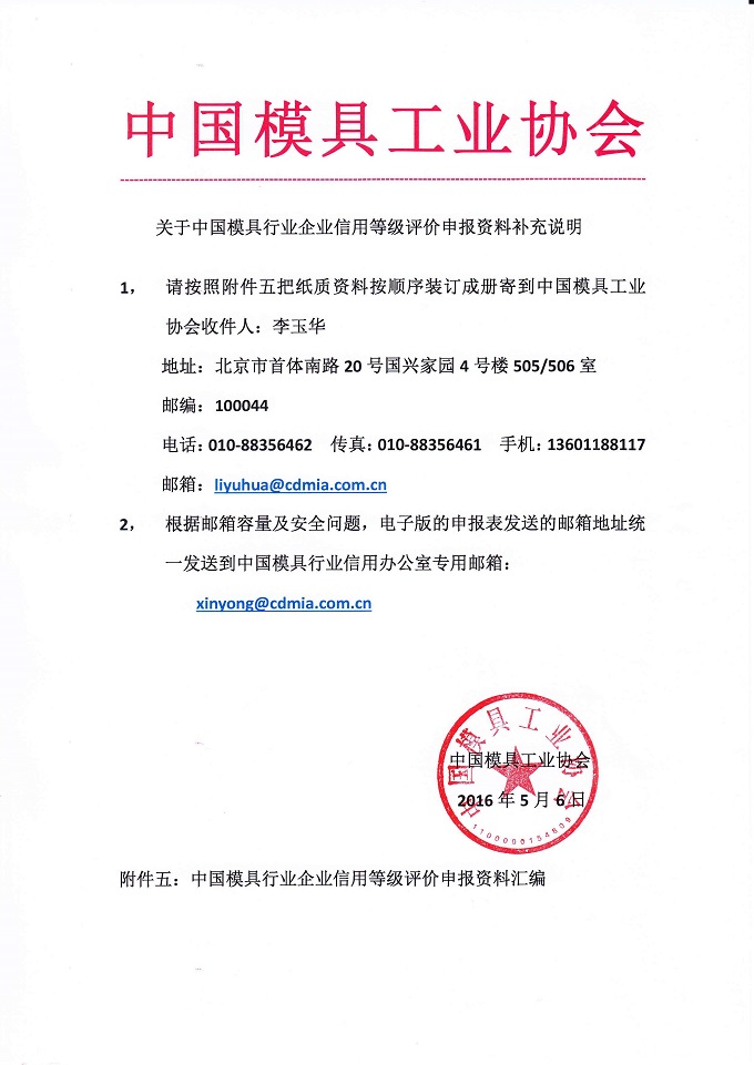 中國模具行業(yè)企業(yè)信用等級評價申報補充材料與說明