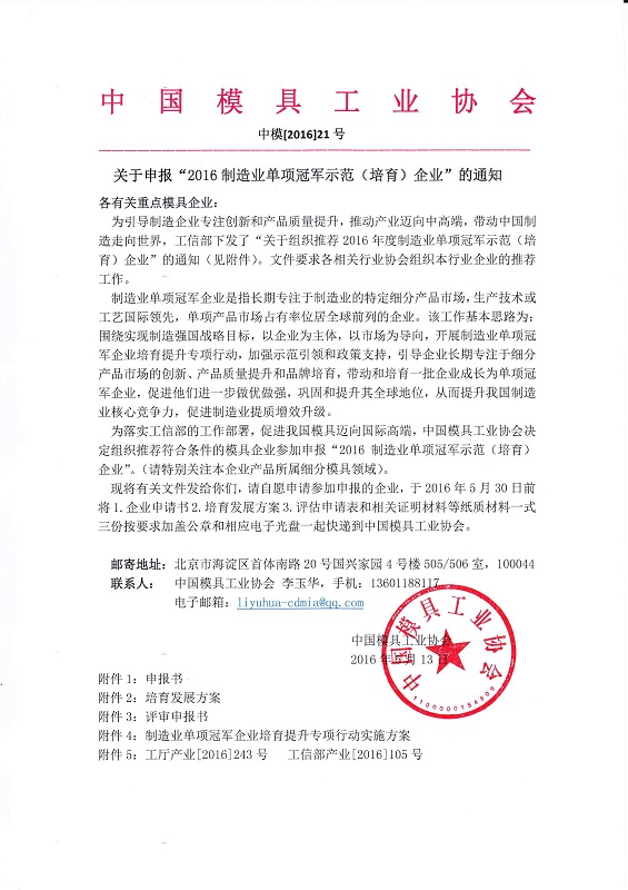 關(guān)于申報“2016制造業(yè)單項(xiàng)冠軍示范(培育)企業(yè)”的通知