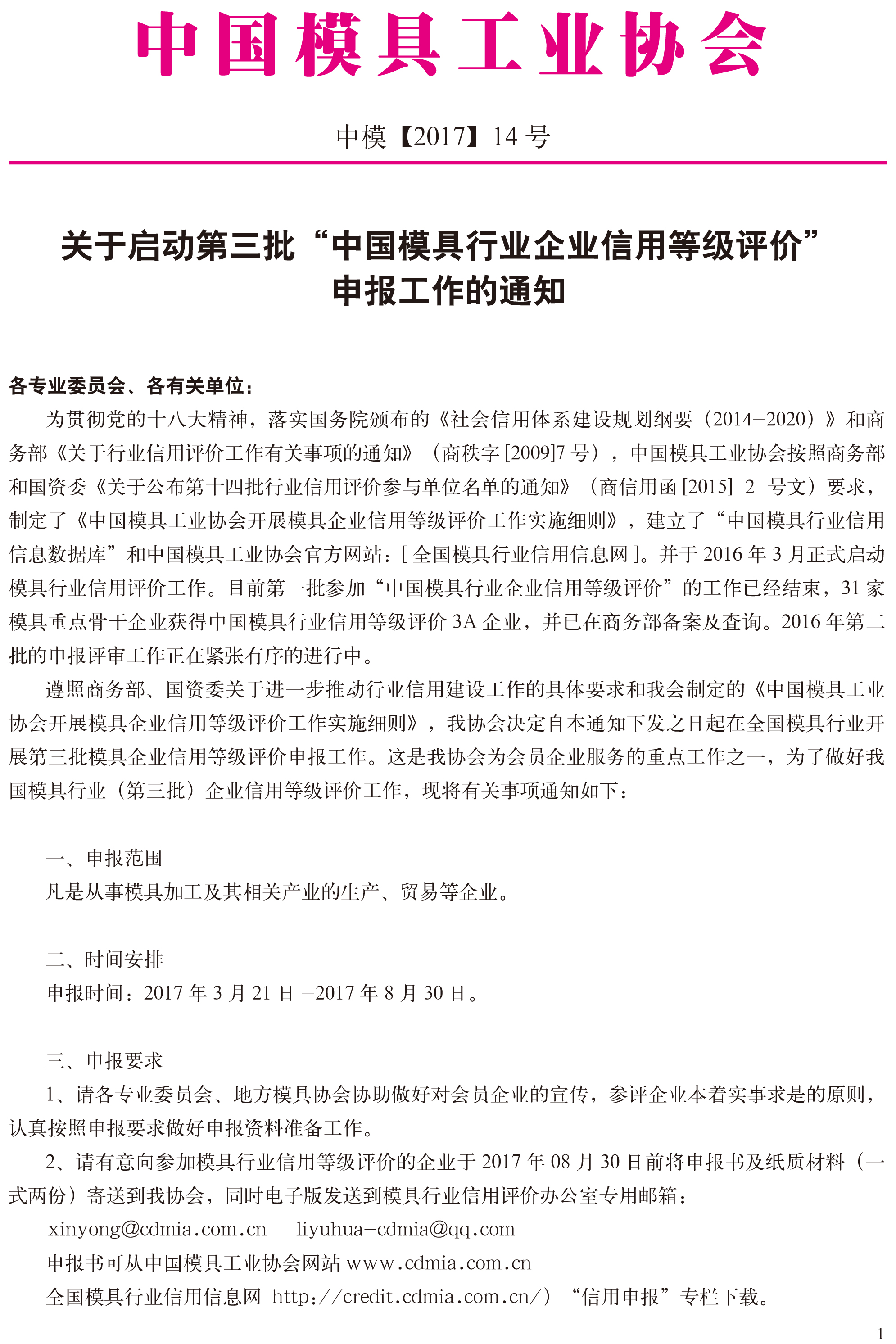 關于啟動第三批“中國模具行業企業信用等級評價”申報工作的通知