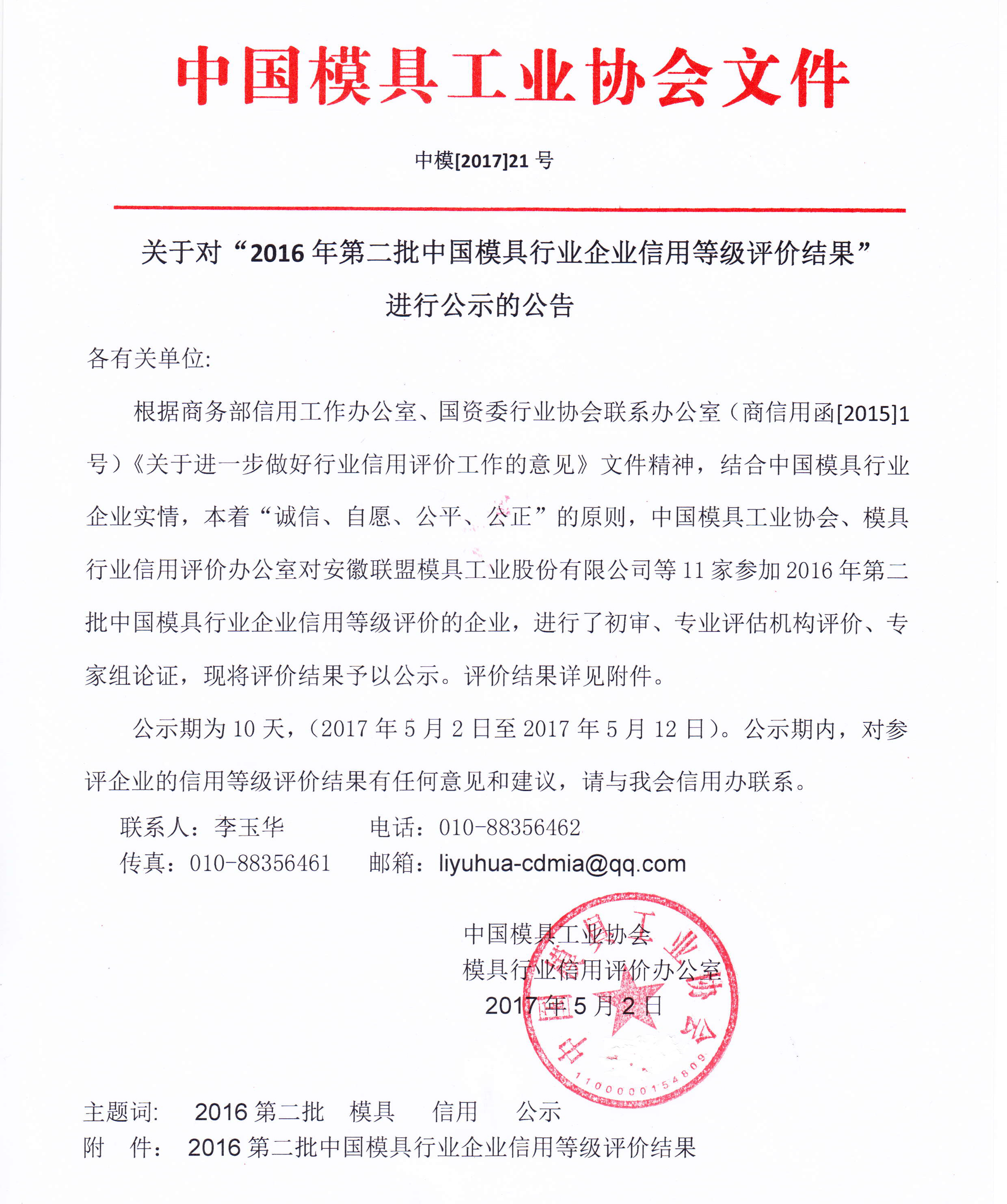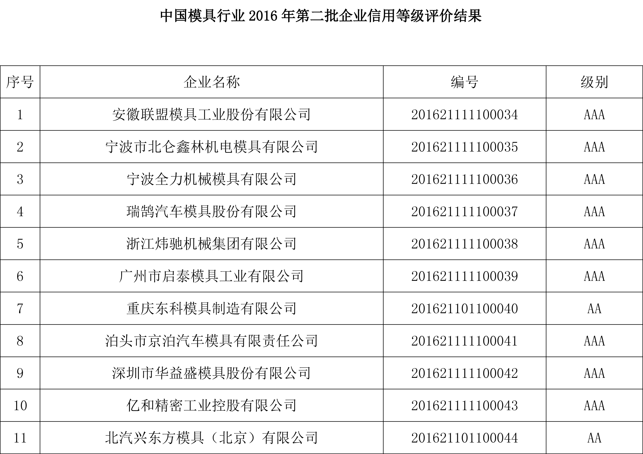 關于對“2016年第二批中國模具行業企業信用等級評價結果”進行公示的公告