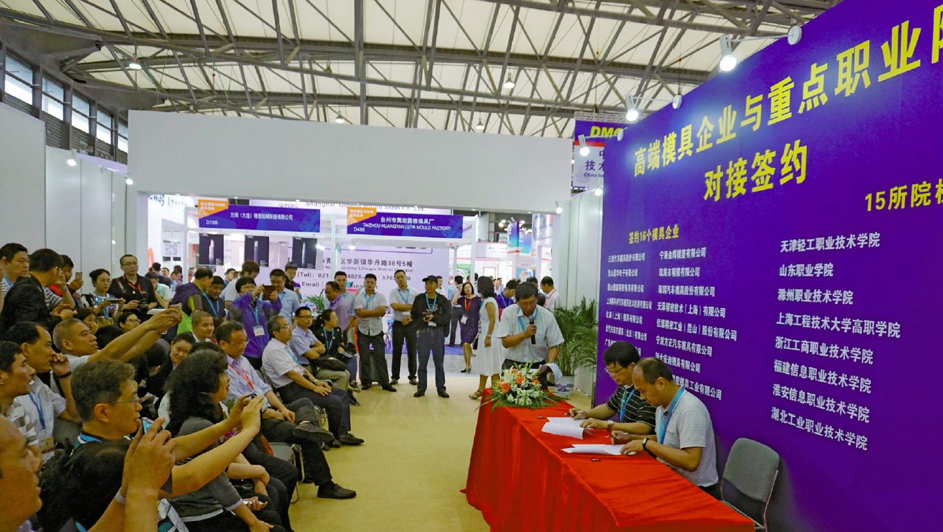 DMC2017開展當天, 13家模具企業(yè)(天津汽車模具股份有限公司、寧海金輝模塑有限公司、昆山嘉華電子有限公司、珠海市精模有限公司、昆山德盛精密模具有限公司、瑞鵠汽車模具股份有限公司、上海賽科利汽車模具技術應用有限公司、天澤精密技術(上海)有限公司、億森(上海)模具有限公司、優(yōu)德精密工業(yè)(昆山)股份有限公司、北汽興東方模具(北京)有限公司、寧波方正汽車模具有限公司、廣東星聯(lián)精密機械有限公司、河北安迪模具有限公司、江蘇榮騰精密組件科技股份有限公司、昆山匯美塑膠模具工業(yè)有限公司)與中國模具工業(yè)協(xié)會職業(yè)院校教育委員會的14所高等職業(yè)院校(天津輕工職業(yè)技術學院、長春汽車工業(yè)高等專科學校、西安航空職業(yè)技術學院、滁州職業(yè)技術學院、江蘇信息職業(yè)技術學院、上海工程技術大學高職學院、寧波職業(yè)技術學院、浙江工商職業(yè)技術學院、廣州番禺職業(yè)技術學院、福建信息職業(yè)技術學院、武漢城市職業(yè)學院、淮安信息職業(yè)技術學院、安徽國防科技職業(yè)技術學院、湖北工業(yè)職業(yè)技術學院)進行了面對面的深入的交流,彼此了解了院校的專業(yè)設置和畢業(yè)生走向以及企業(yè)的需求,并在“權責分明、資源共享、優(yōu)勢互補、平等互利、共同發(fā)展”的框架下,形成了戰(zhàn)略合作意見。