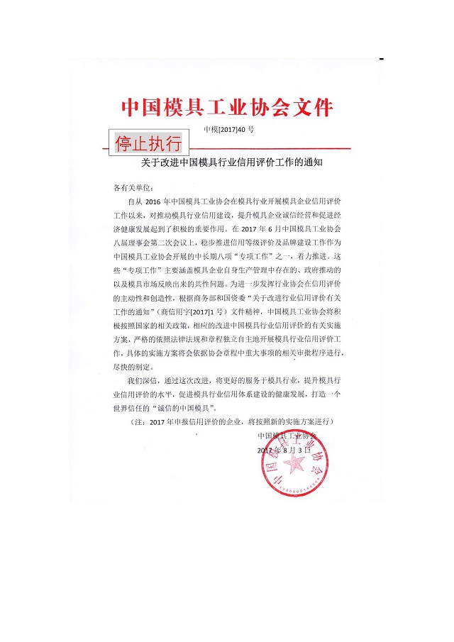 關于改進中國模具行業(yè)信用評價工作的通知