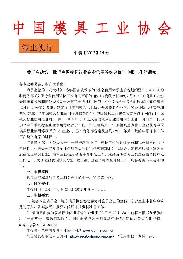 關(guān)于啟動第三批“中國模具行業(yè)企業(yè)信用等級評價(jià)”申報(bào)工作的通知