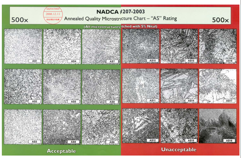 NADCA 207#-2003標準中進行了修訂,劃分依據(jù)是偏析帶中是否存在可見的大顆粒一次碳化物,存在即判為不合格,并且不再區(qū)分不同鋼種的帶狀組織。如下圖: