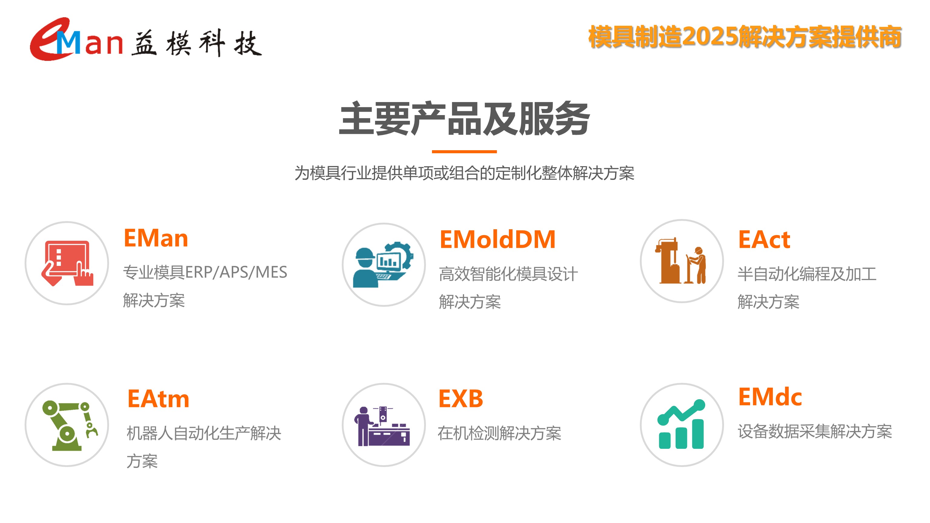 公司目前主要產品包括EMan 專業模具ERP/APS/MES;EMoldDM 高效智能化模具設計整體解決方案;EAct 模具/刀輔具半自動化加工解決方案;EAtm CNC/CMM/EDM全自動化加工單元解決方案;EXB在機檢測解決方案等產品及其技術服務,產品應用覆蓋汽車、家電、電子、手機/數碼、金屬制品、建材等各個行業領域,客戶遍布全國17個省市乃至德國、越南等海外區域。