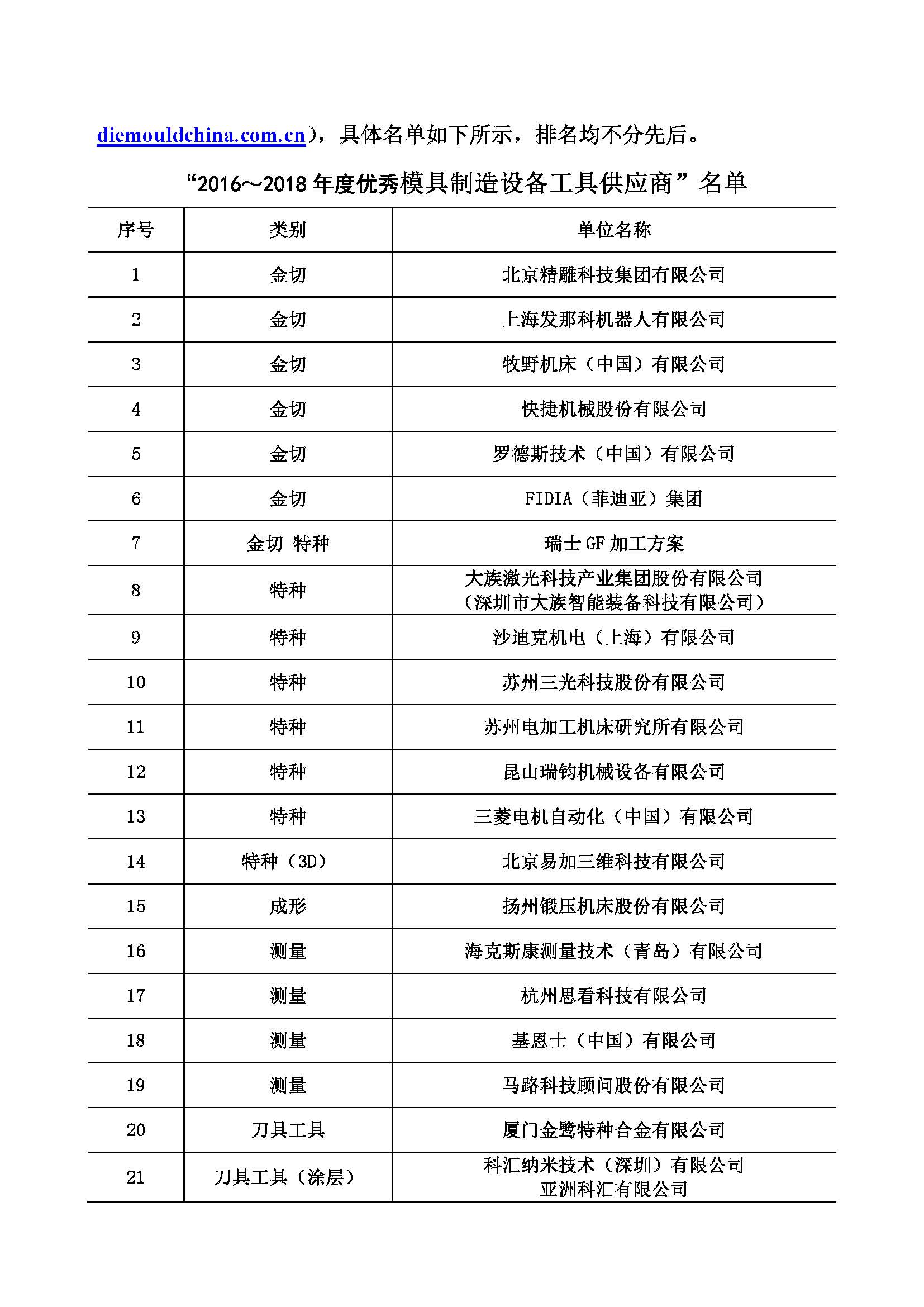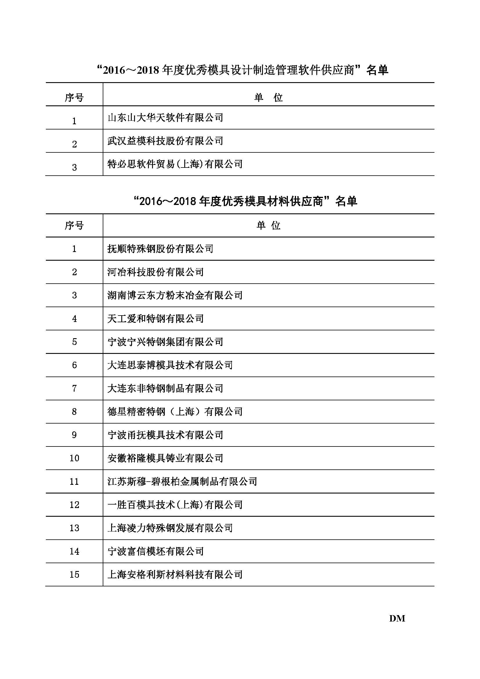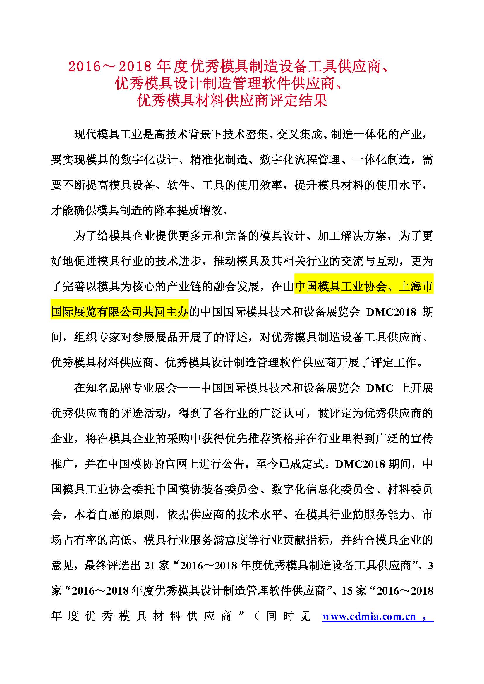 2016~2018年度優(yōu)秀模具制造設(shè)備工具供應(yīng)商、 優(yōu)秀模具設(shè)計制造管理軟件供應(yīng)商、 優(yōu)秀模具材料供應(yīng)商評定結(jié)果