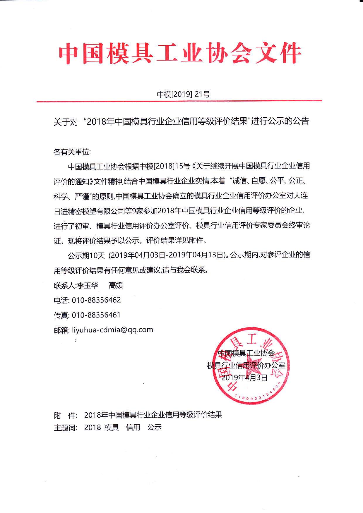 關(guān)于對(duì)“2018年中國(guó)模具行業(yè)企業(yè)信用等級(jí)評(píng)價(jià)結(jié)果”進(jìn)行公示的公告