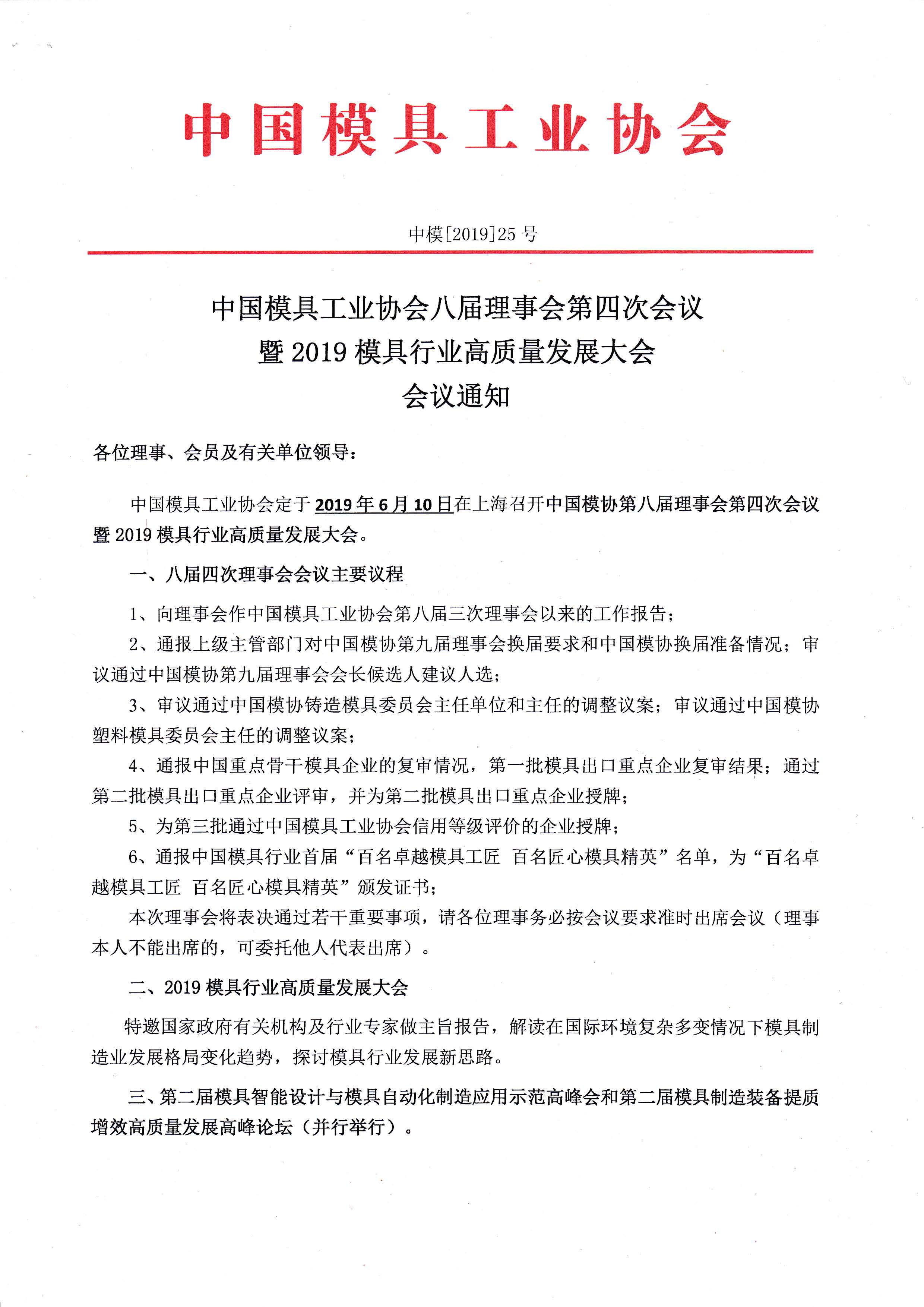 中國模具工業(yè)協(xié)會八屆理事會第四次會議暨2019模具行業(yè)高質量發(fā)展大會會議通知