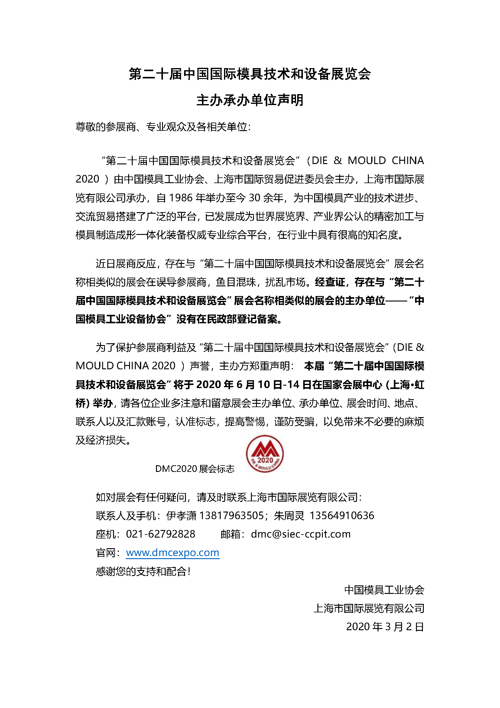 第二十屆中國國際模具技術和設備展覽會主辦承辦單位聲明