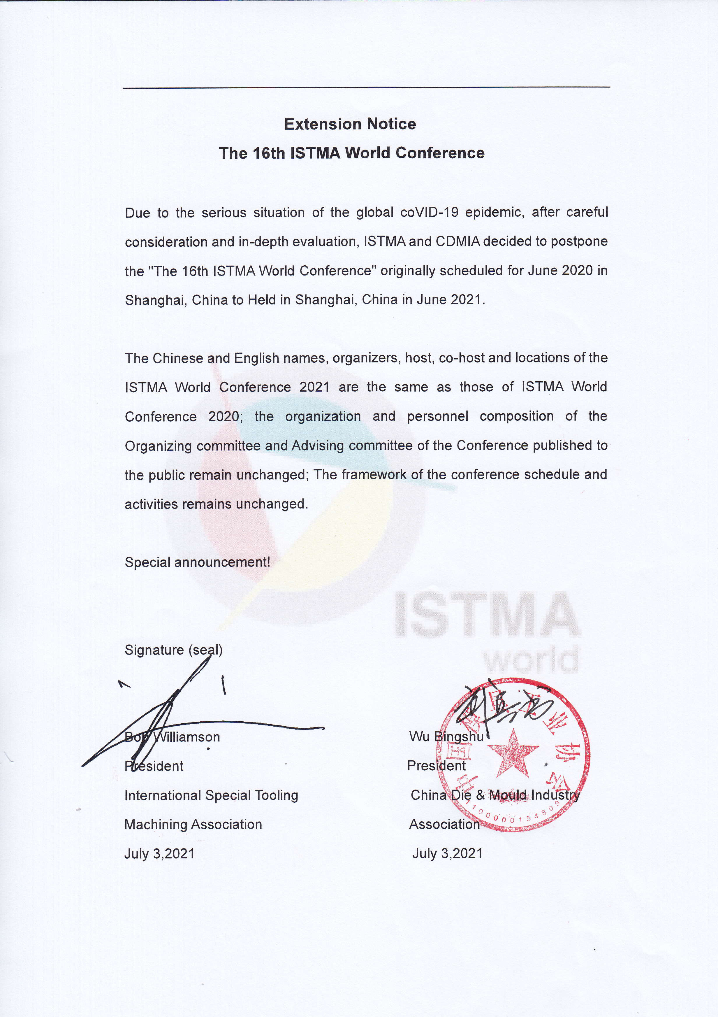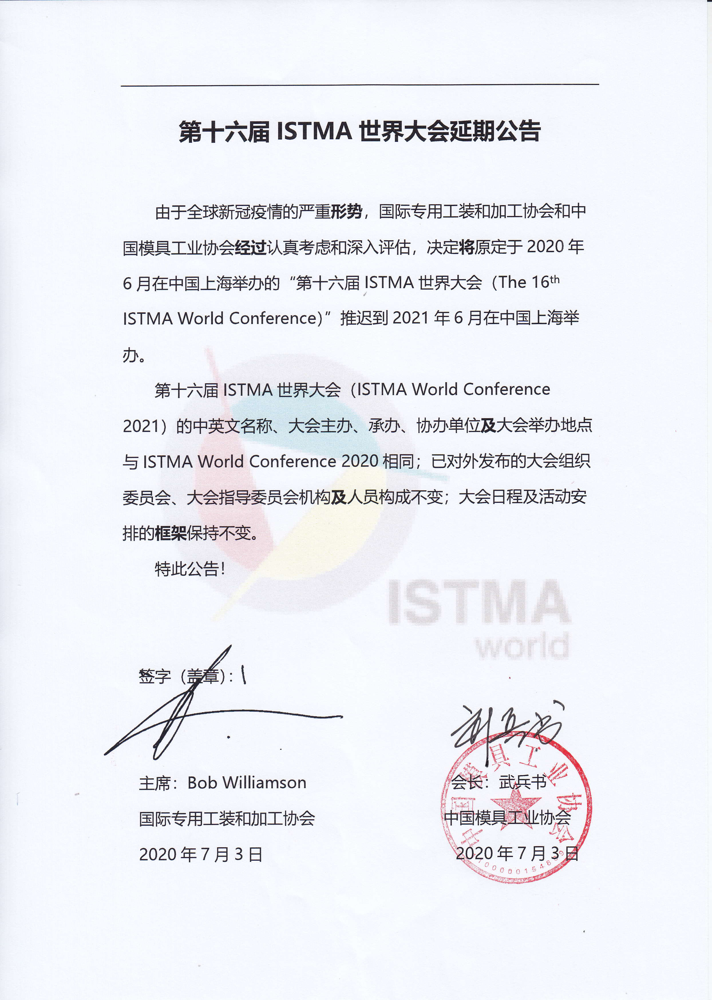 第十六屆ISTMA世界大會延期公告