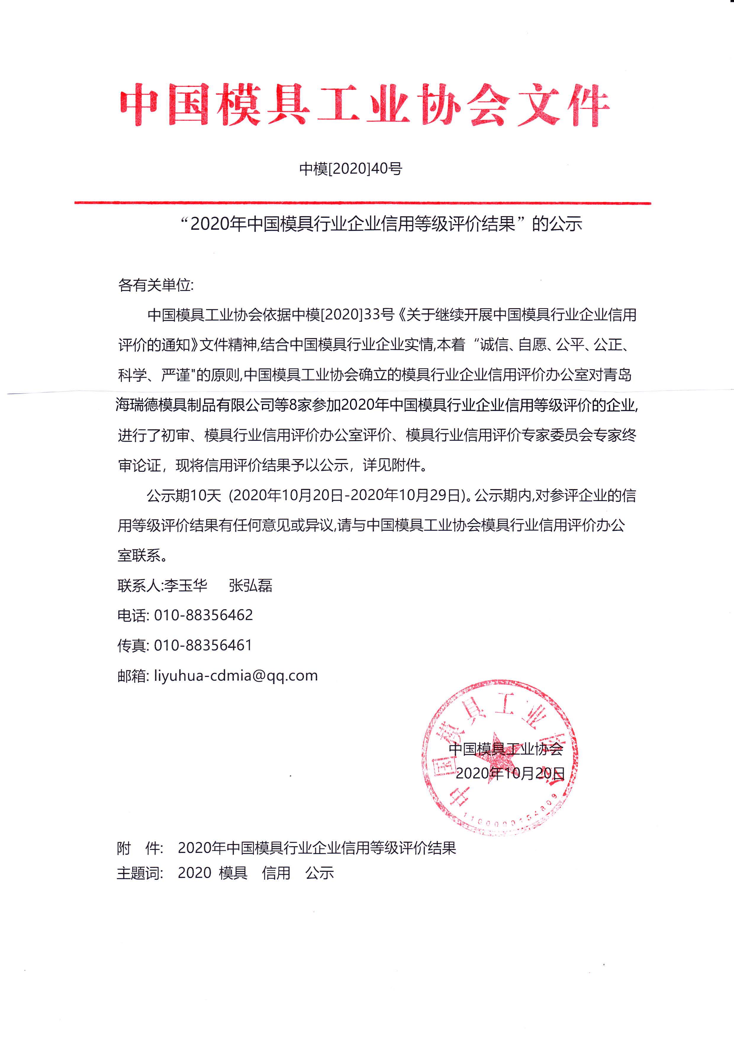 “2020年中國模具行業(yè)企業(yè)信用等級(jí)評(píng)價(jià)結(jié)果”的公示