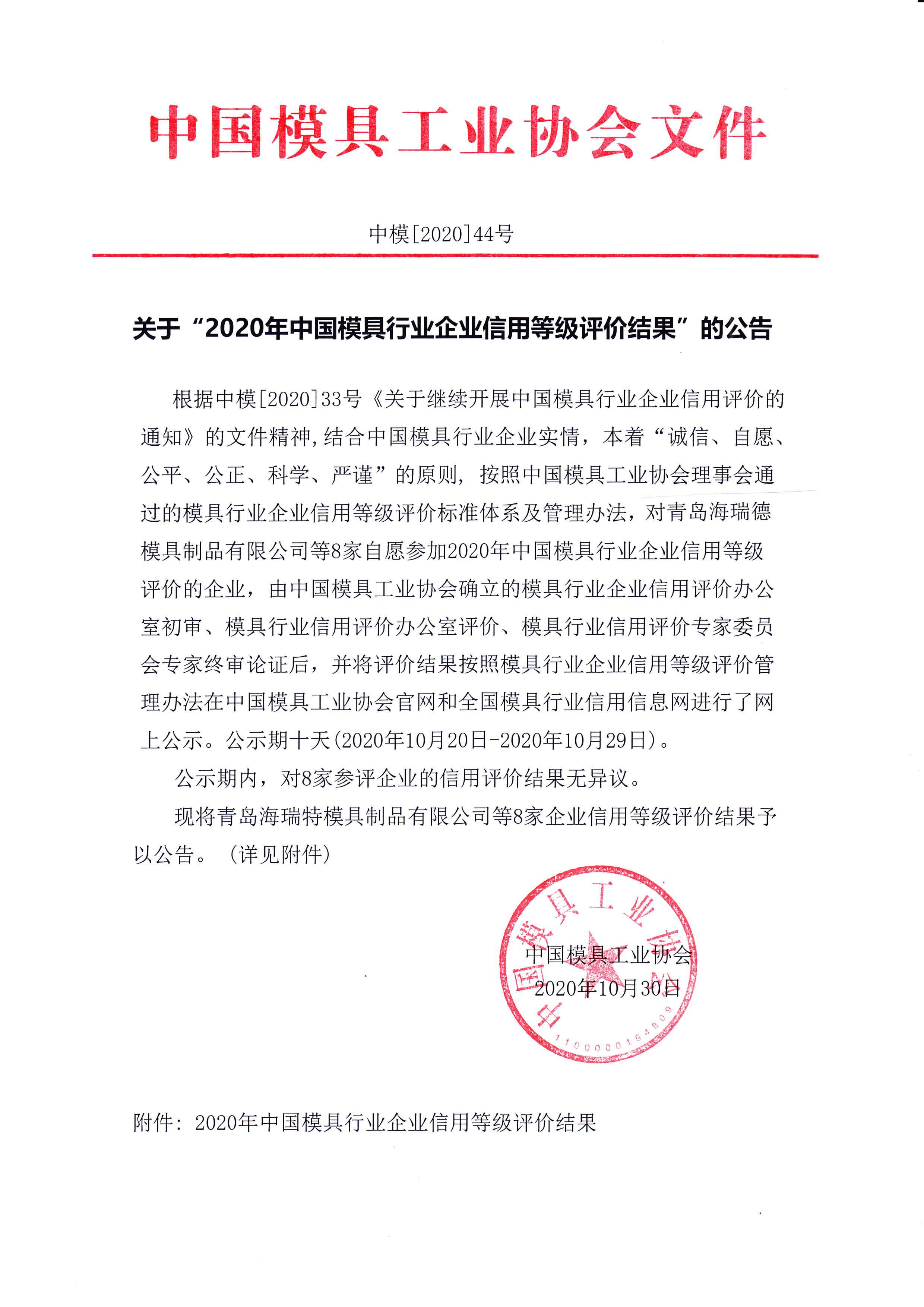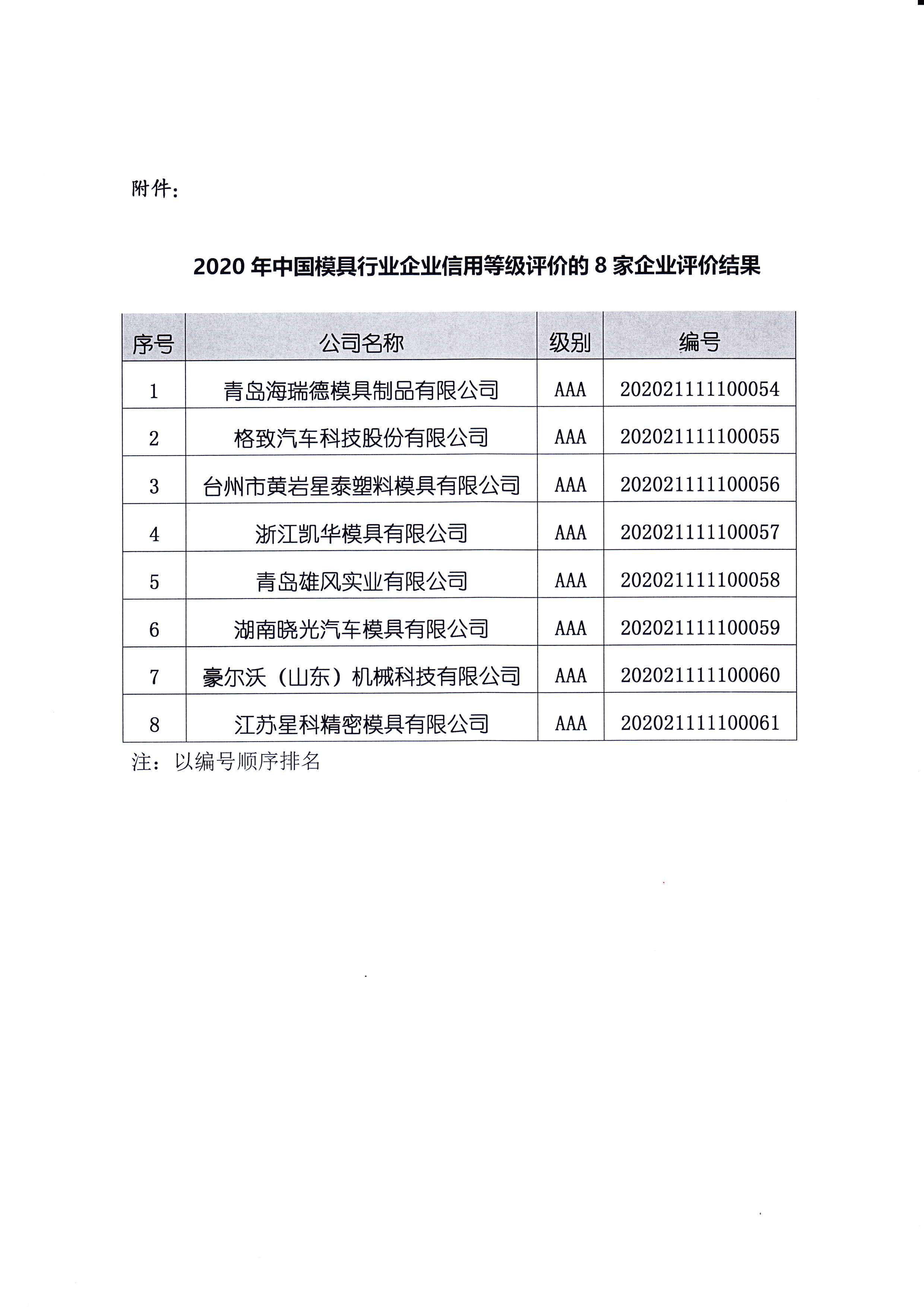 關(guān)于“2020年中國(guó)模具行業(yè)企業(yè)信用等級(jí)評(píng)價(jià)結(jié)果”的公告
