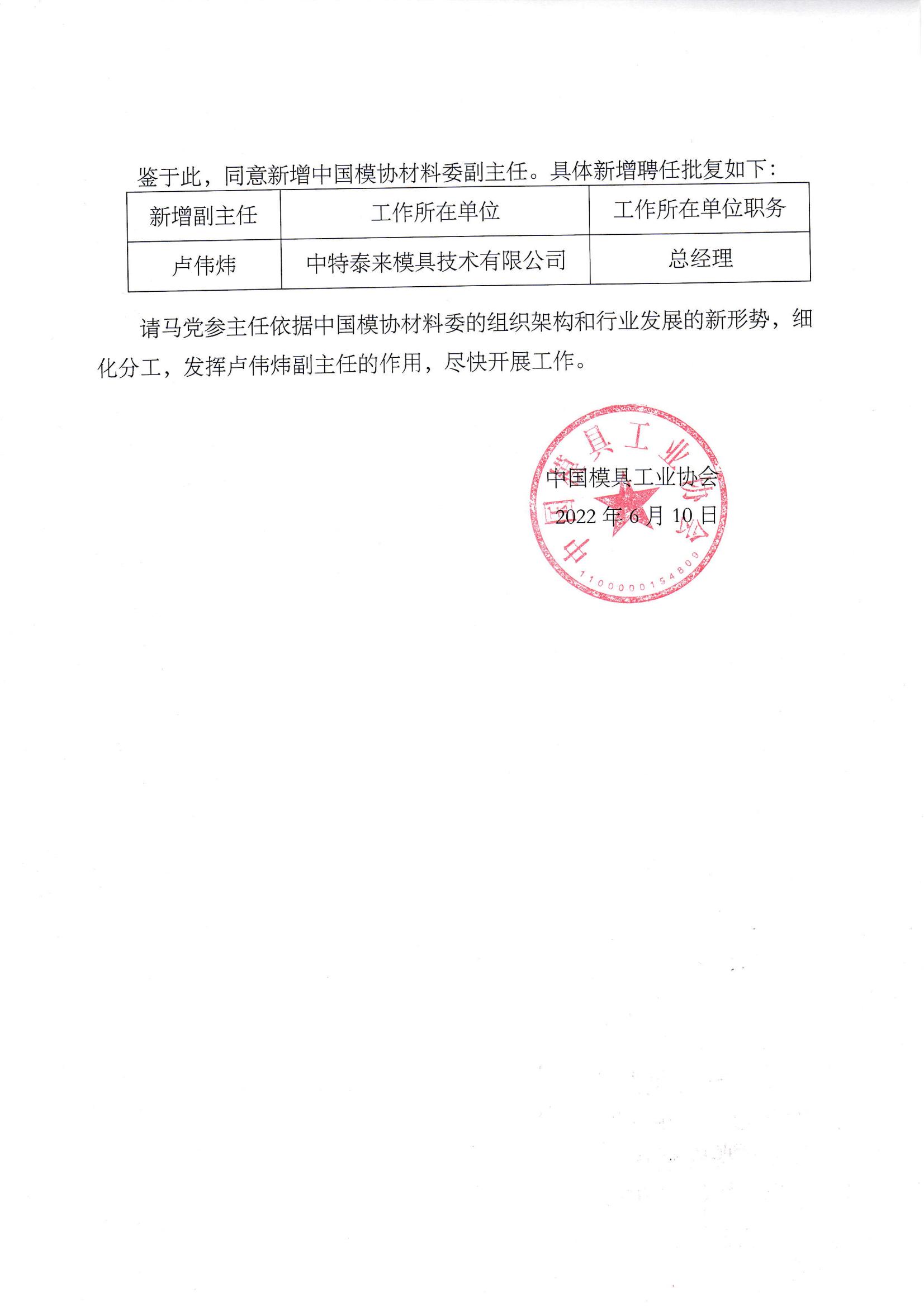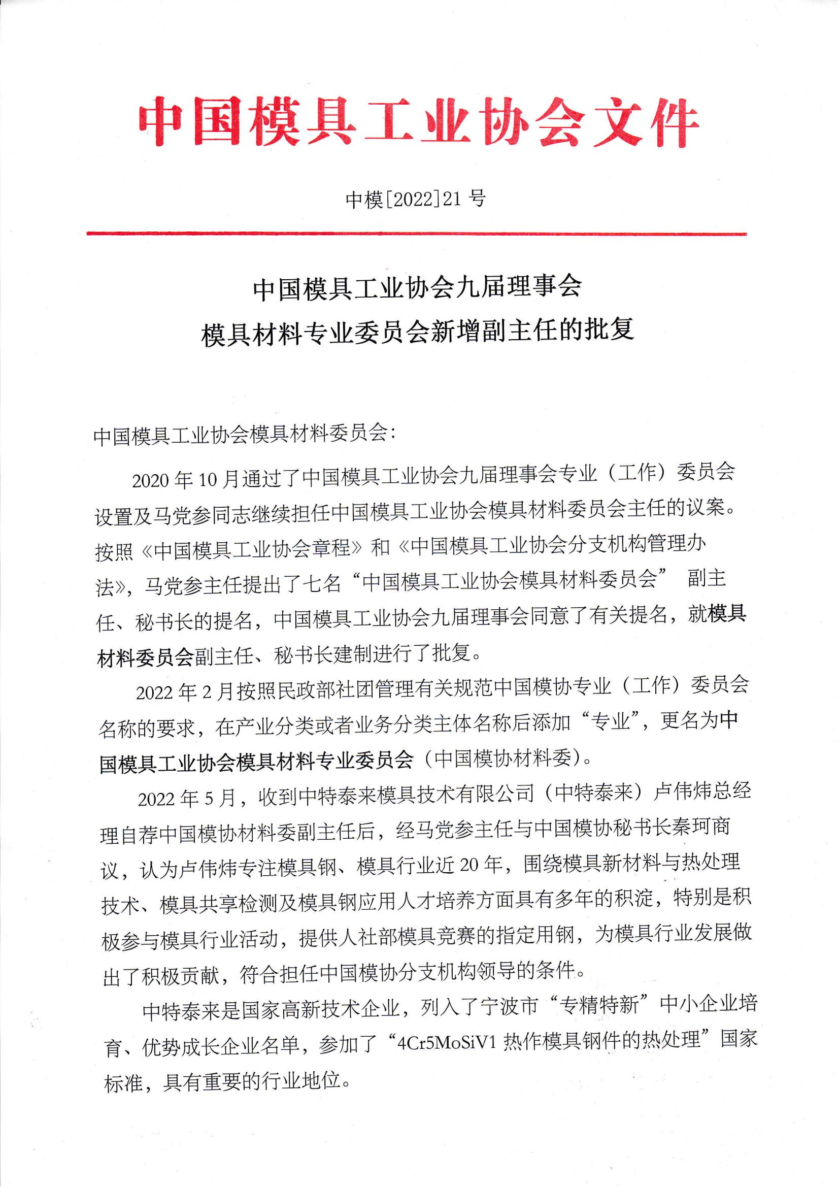 模具材料專業委員會新增副主任的批復