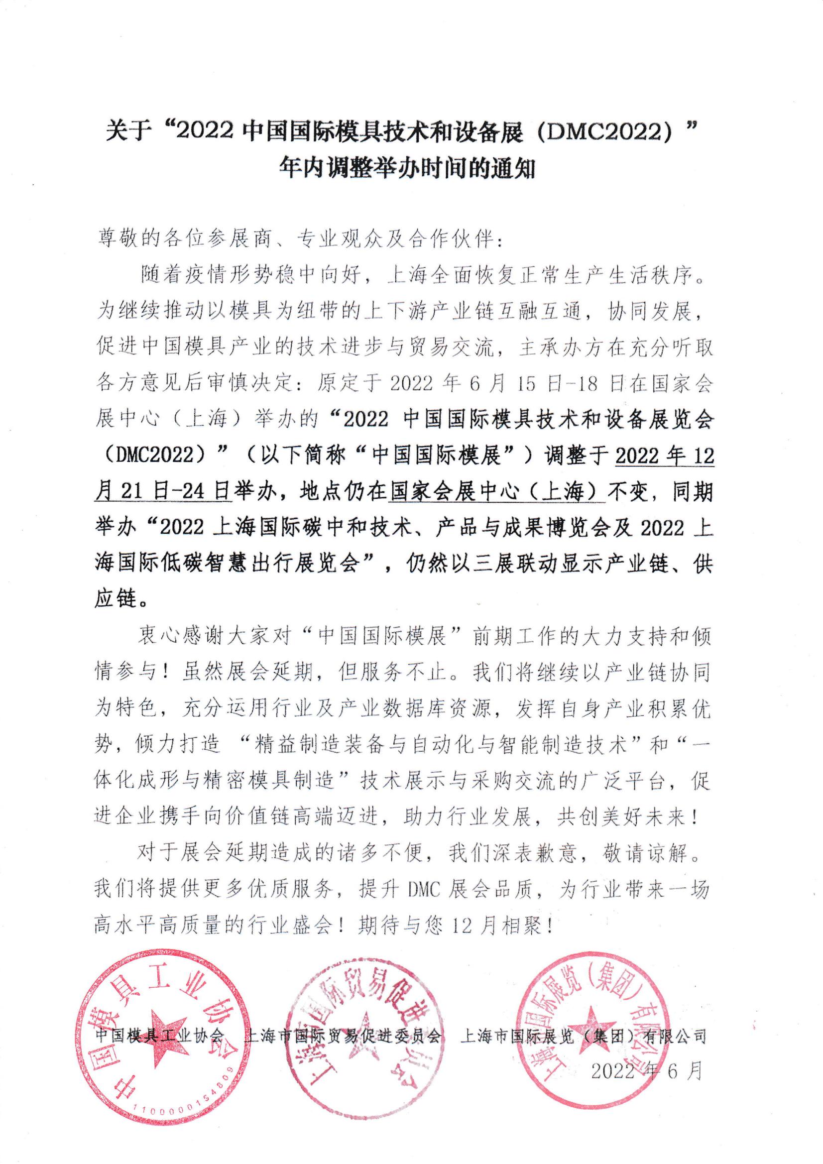 關(guān)于“2022中國國際模具技術(shù)和設(shè)備展(DMC2022)年內(nèi)調(diào)整舉辦時間的通知”