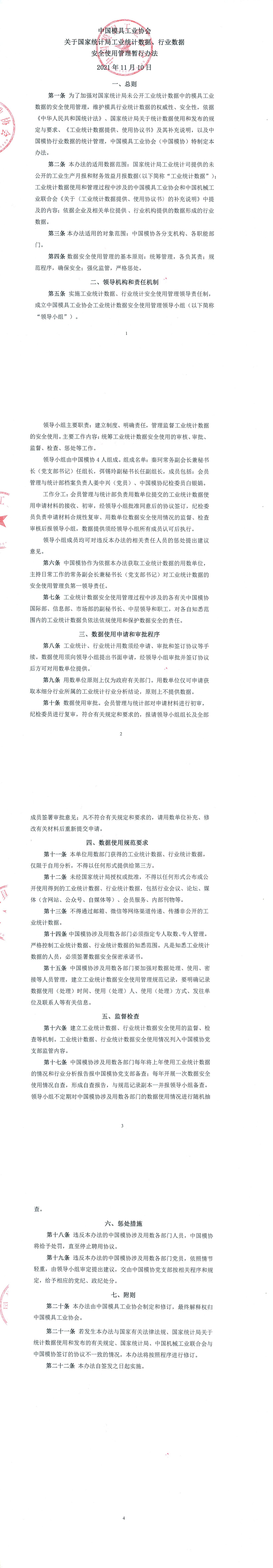 中國模具工業(yè)協(xié)會關于國家統(tǒng)計局工業(yè)統(tǒng)計數(shù)據(jù)、行業(yè)數(shù)據(jù)安全使用管理暫行辦法