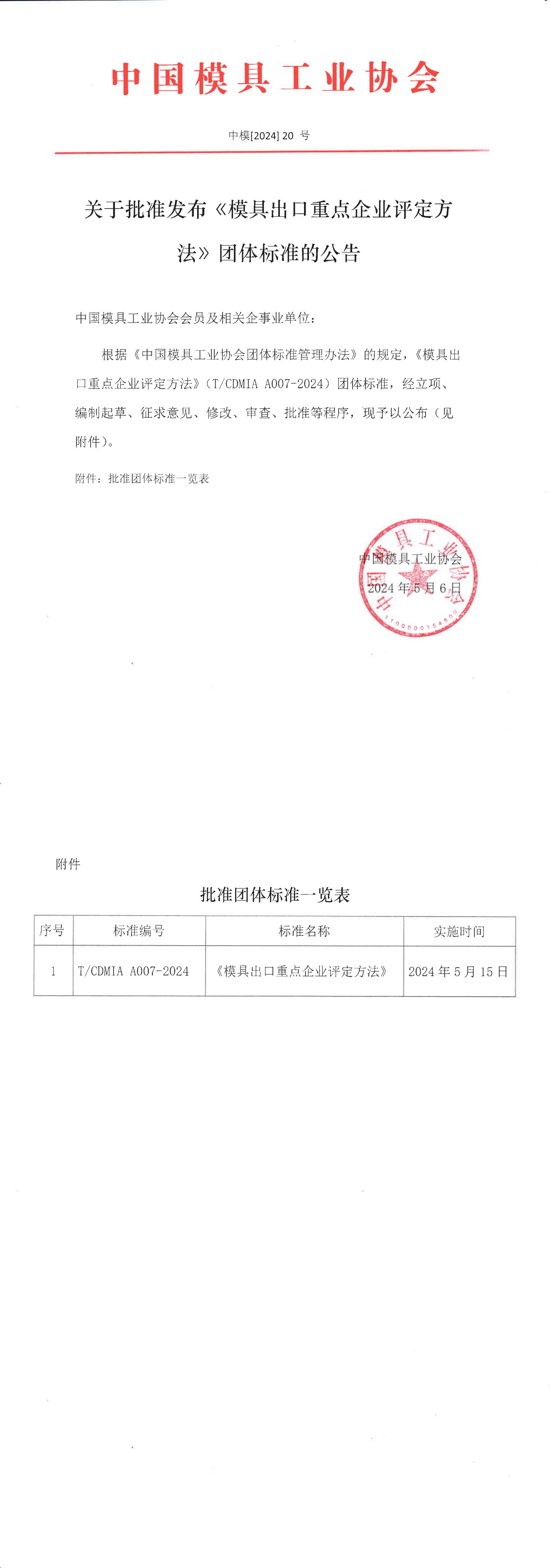 關(guān)于批準(zhǔn)發(fā)布《模具出口重點(diǎn)企業(yè)評定方法》團(tuán)體標(biāo)準(zhǔn)的公告